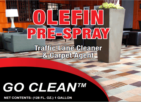 Olefin Pre-Spray has been formulated for olefin fiber carpets usually found in offices, facilities, institutions, apartment, and in many commercial buildings. Formulated with high-grade detergents, solvents, and surfactants to loosen and remove soils that adhere to fibers as well as sticky oils and greases that can cause unsightly yellowing and fiber discoloration. Dilution: 1:16 or 9.5oz to a Gallon PH: 13-14