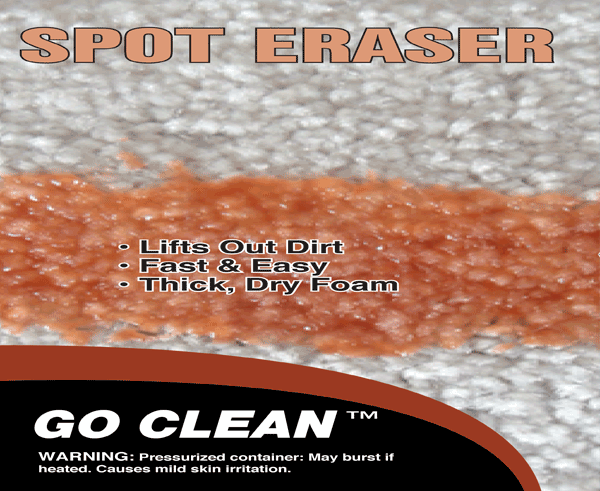 Spot Eraser is a thick, dry foam that simultaneously lifts out and holds up dirt and grime in suspension until vacuumed away. Use on spills right away! Helps avoid hard-to-remove stains later. Spot Eraser spot cleans fast and easy saving YOU time and labor!
